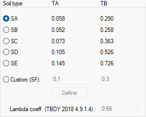 Soil type Soil type that determine the spectrum curve are determined according to the ground on which the building is located. The spectrum curve is renewed according to the selected soil type. It is one of the parameters selected in 2018 TDY wizard for analysis settings, and this row is automatically refreshed when the wizard is used. ![]() |