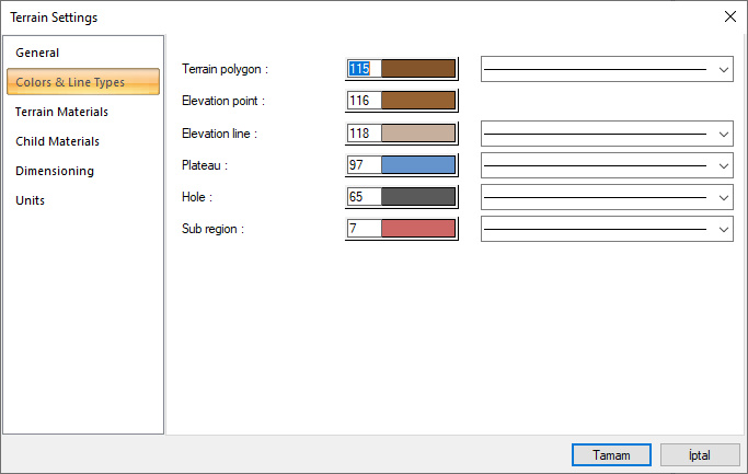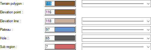 ![]() You can determine the color and line types of the polygon, elevation point, elevation line, plateau, hole and sub region elements respectively by clicking the list. |