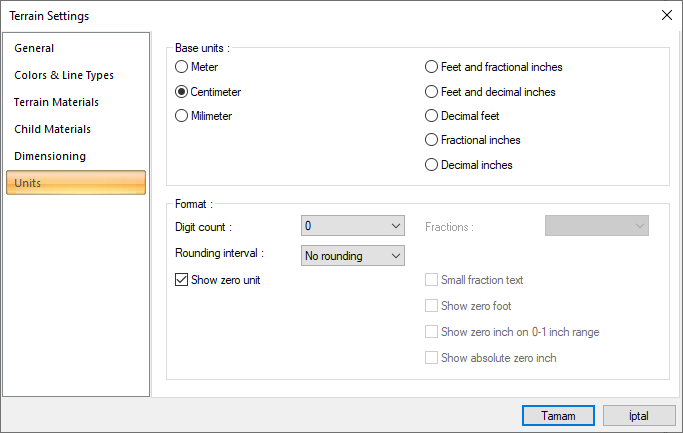 Fractions ![]() It determines the precision of the dimension to be made in fractional inch format. In the list, there are options with a sensitivity of 1/2, ¼, 1/8, 1/16, 1/32, 1/34. If "no fraction" is selected, units will appear without fractions. |