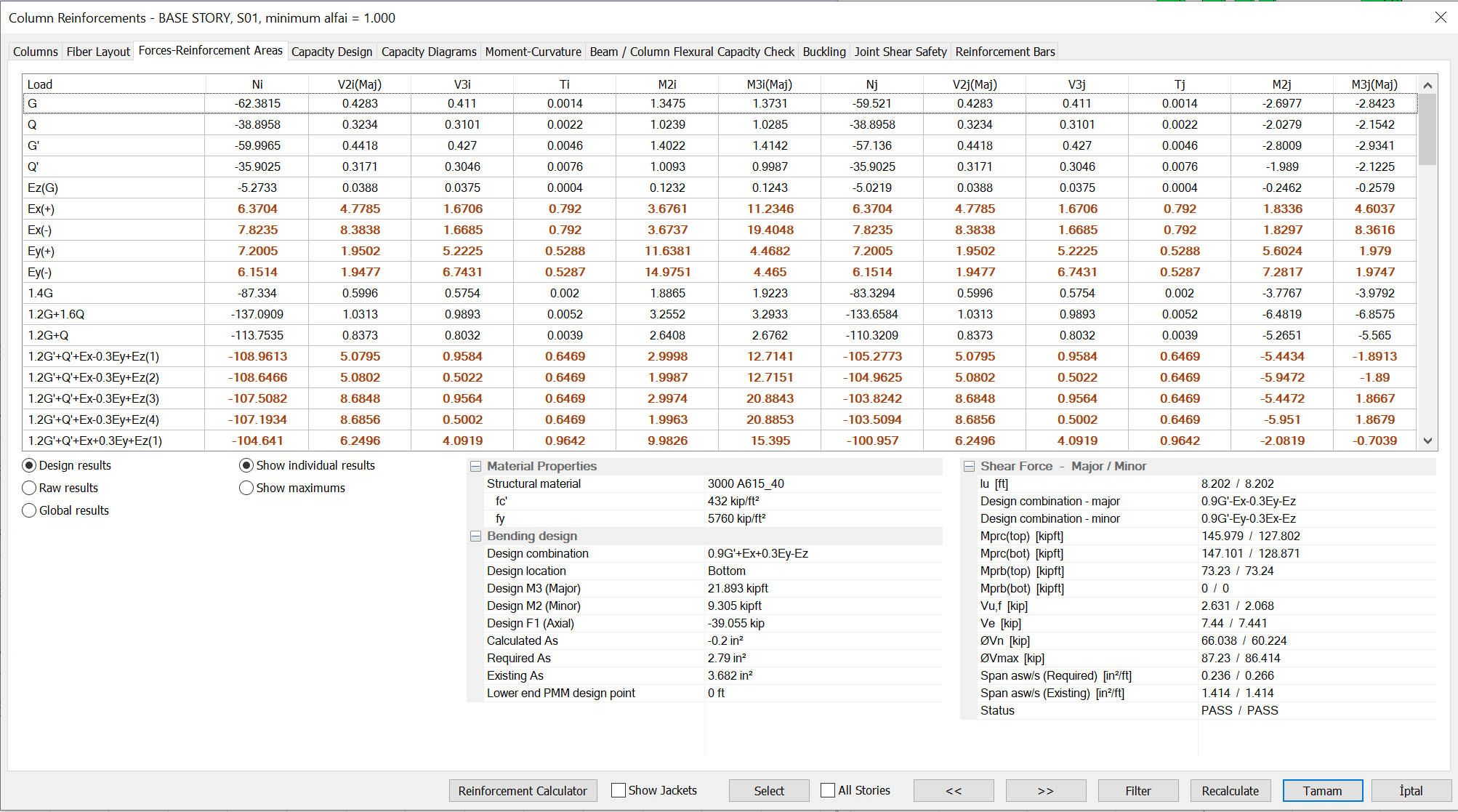 Earthquake effects determined in the horizontal X and Y directions perpendicular to each other are automatically combined according to Section C12.5. It is detailed in the program interface and reports. The horizontal earthquake effect is symbolized by Ex and Ey, it is included in the heading of loading status and loading combinations in the select report. Within the loading combinations, the joining according to the 30% rule is also made and the coefficients of the horizontal directions are specified in the combination. It will be seen in the strength-reinforcement area tab in the reinforced concrete column dialog shown below, for example.