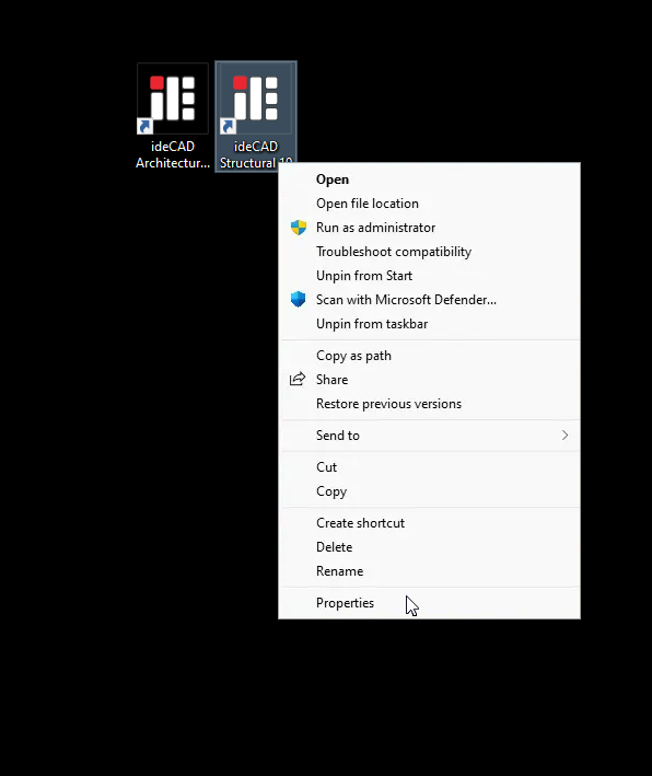 Click Properties in the menu that opens . The ideCAD Structural 10 Properties dialog will open.