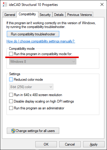 In the dialog, on the Compatibility tab, uncheck the line “Run this program in compatibility mode for”.