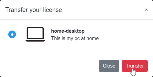 Click on the transfer icon at the end of the license to be transferred to the device B (home-desktop e.g.).