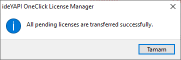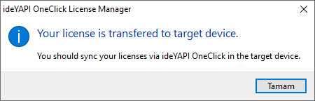 Information is given that Your license is transfered to target device. You should sync your license via ideYAPI OneClick in the target device.