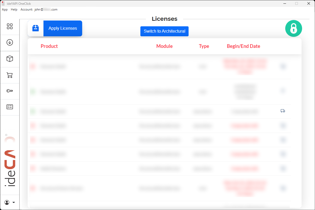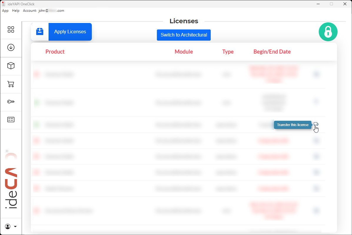 Licenses with the transfer (truck) symbol at the end of the line can be transferred to the device B (home-desktop e.g.).