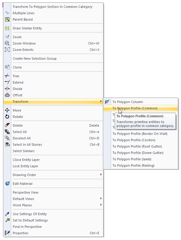 You can access the Transform/To Polygon Profile command from the right click menu. Transform/To Polygon Profile command; to polygon profile (common), to polygon profile (sweep), to polygon profile (ceiling cornice), to polygon profile (baseboard), to polygon profile (border on wall), to polygon profile (cordon), to polygon profile (roof gutter), to polygon profile (dome gutter), to polygon profile (jamb) andto polygon profile (railing) options.