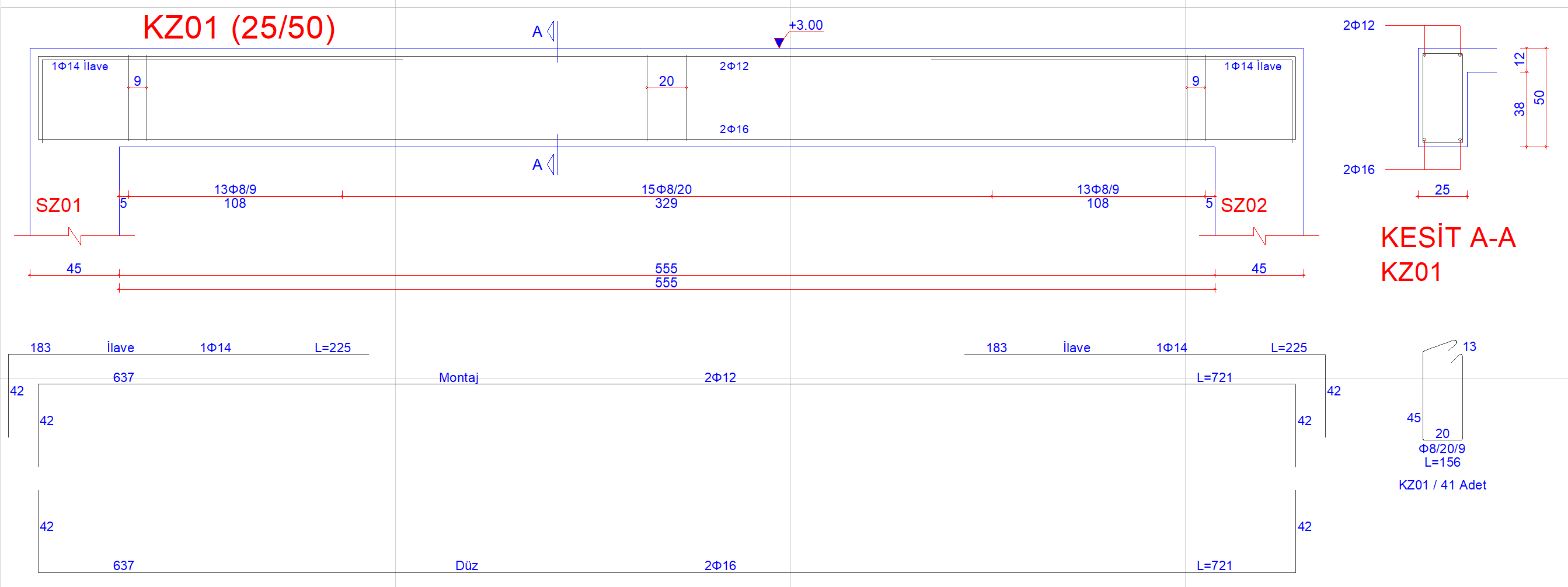The region that is twice the height of the beam from the column surface in beam supports is called the Confinement Zone . Throughout this zone, special seismic hoops defined in TBDY Section 7.2.8 are used. It is not allowed to use reinforcement with a rebar diameter less than bölgeler8 in the confinement areas and the first stirrup of the confinement zone is placed 50 mm from the column face.