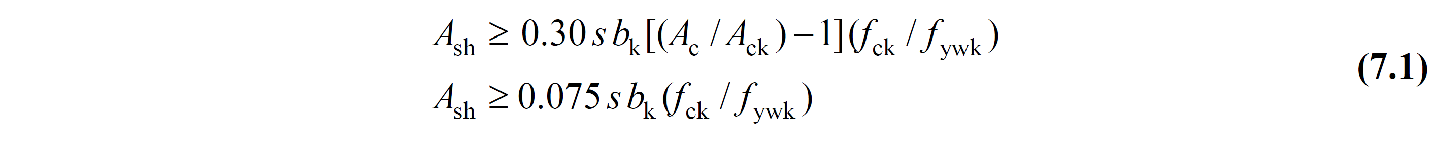 (b) In case of N d > 0.20 A c f ck (pressure ) in stirruped columns, the minimum total transverse reinforcement area in the confinement zones shall be calculated in such a way that the conditions given in Equation (7.1) are unfavorable. In this calculation, the core size b k of the column will be considered separately for both directions ( Figure 7.3 ):
