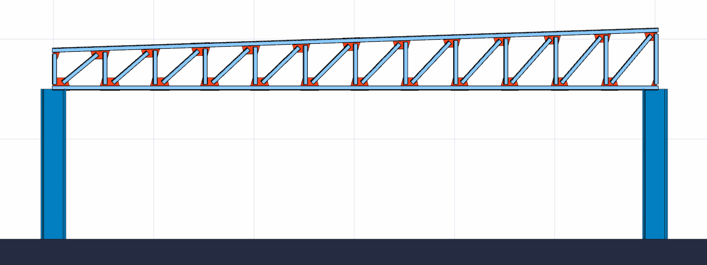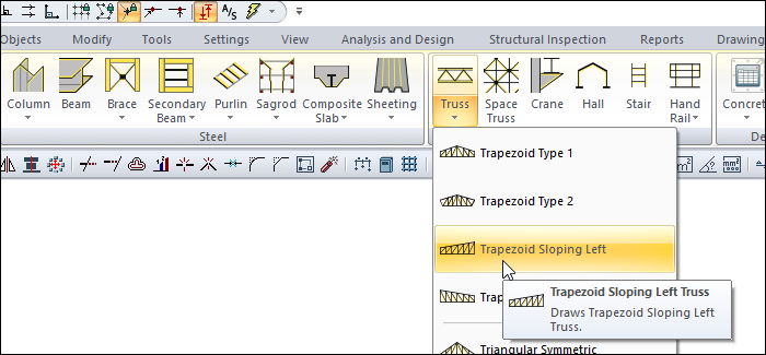 With the Trapezoid Sloping Left command, the trapezoid sloping left truss type, which is one of the prepared truss types, is drawn quickly. Truss heights are adjusted from the truss settings.