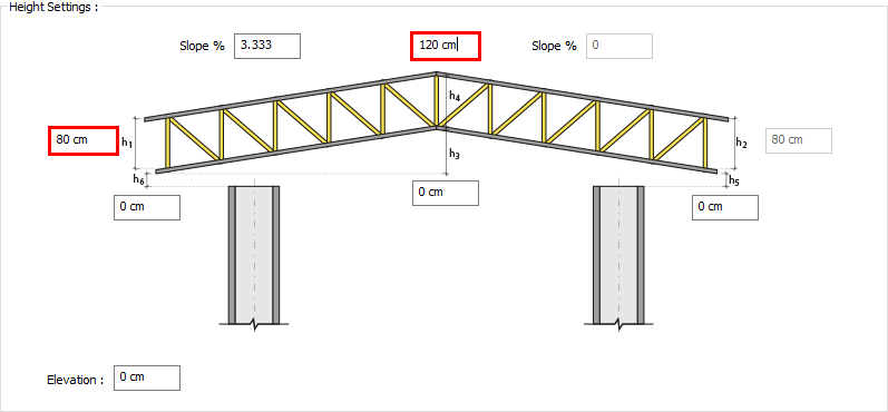 Entering 80 cm for h1 and 120 cm for h4 in the height tab of the truss settings ![]() |