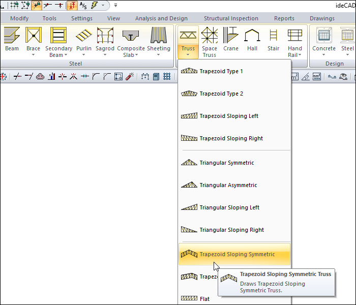 With the Trapezoid Sloping Symmetric command, the trapezoid sloping symmetric truss type which is one of the prepared truss types, is drawn quickly. Truss heights are adjusted from the truss settings.