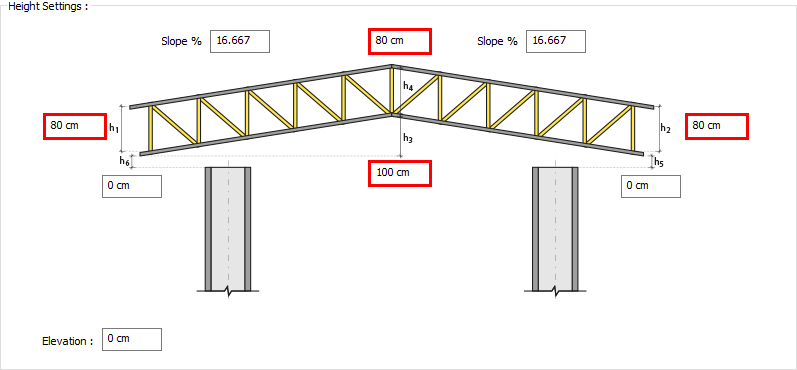Entering 80 cm for h1, h2, h4 and 100 cm for h3 in the height tab of the truss settings ![]() |