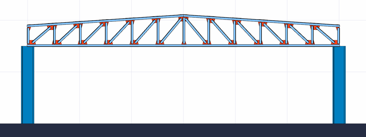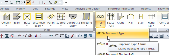 With the Trapezoid Type 1 command, the trapezoid truss type which is one of the prepared truss types, is drawn quickly. Truss heights are adjusted from the truss settings.