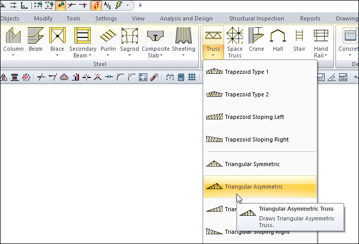 With the Triangular Asymmetric command, the triangular asymmetric truss type which is one of the prepared truss types is drawn quickly. Truss heights are adjusted from the truss settings.