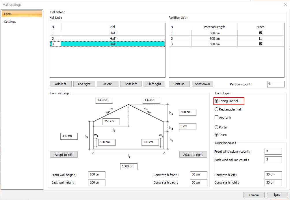 With the triangular hall type settings, the building type of the selected hall in the hall settings dialog is changed. The roof of the hall is defined as a portal so it has become a gable roof geometry.