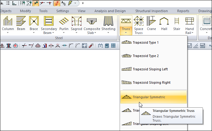 With the Triangular Symmetric command, the triangular symmetric truss type which is one of the prepared truss types, is drawn quickly. Truss heights are adjusted from the truss settings.