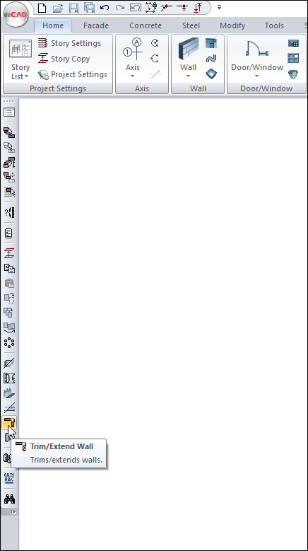 The Trim/Extend Wall command is used to join two walls whose extensions intersect. Trim/Extend Wall command is only valid for walls.