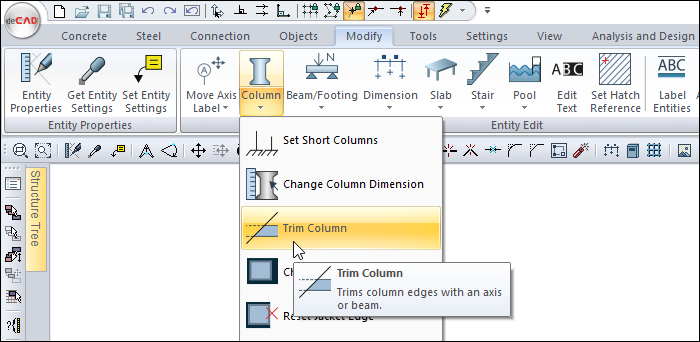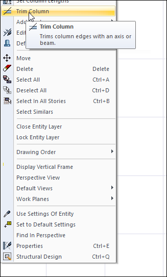 Trim Column command is used to deform the column edges. It is valid for rectangular and polygon columns. It is not used in circle columns. With this method, the dimensions of the polygon columns can be easily changed. A rectangular column trimmed with the trim column command loses its rectangular column feature and falls into the polygon column class.