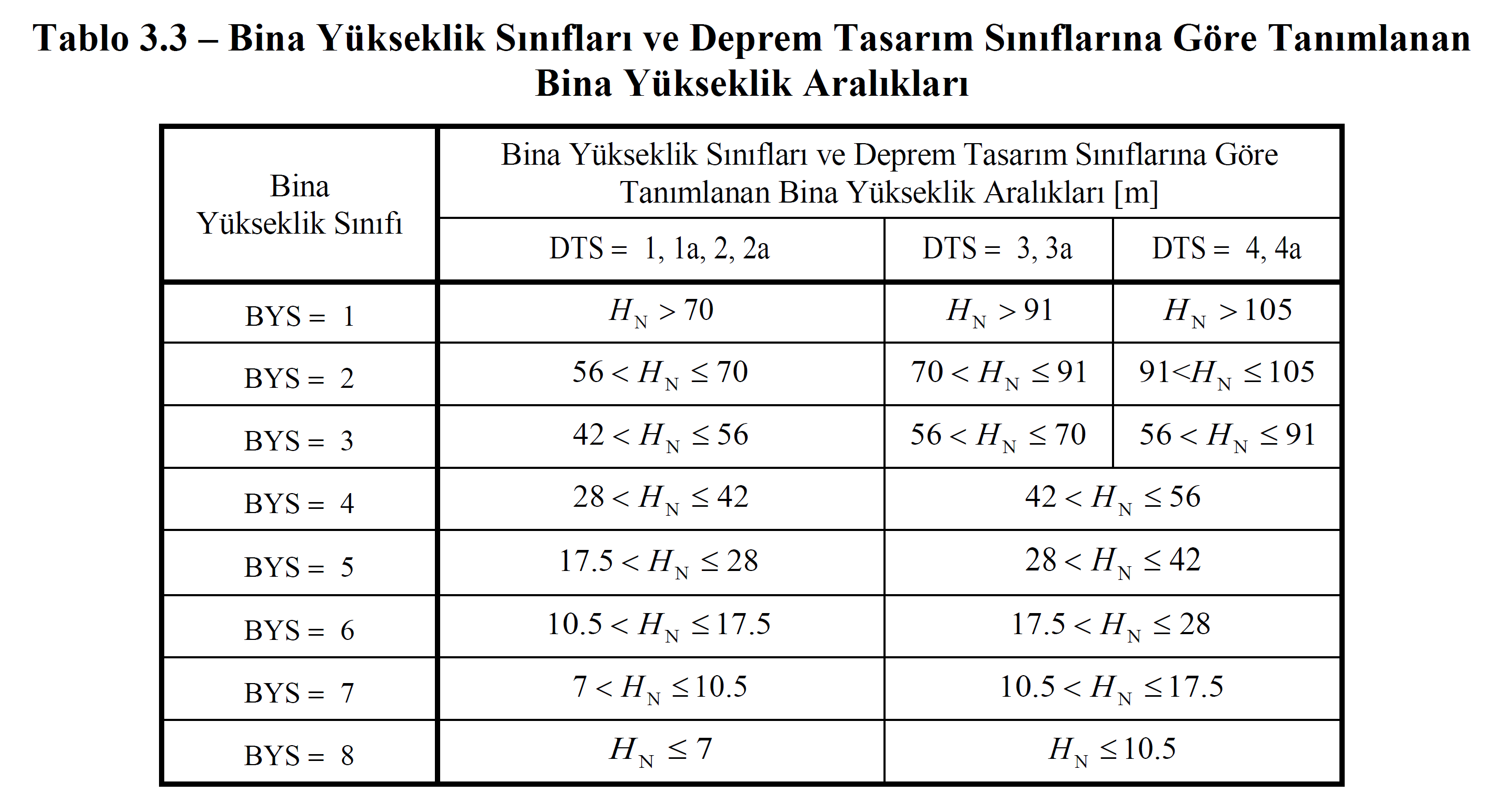 3.3.2.1 - In the design under the effect of earthquake, buildings are divided into eight Building Height Classes (IMS) in terms of height . The height ranges defined on the basis of 3.3.1.3 for buildings in these classes are given in Table 3.3 depending on the Earthquake Design Classes in Table 3.2 .