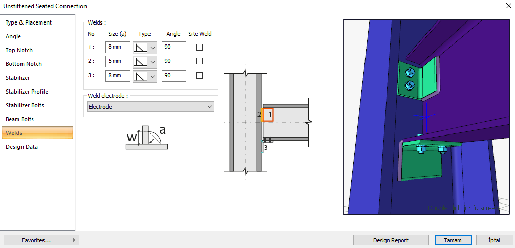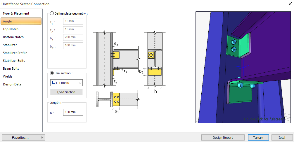 Unstiffened seated connection is a type of connection that connects two profiles to each other with two angles (cornier or L profile). Bolt control, weld control and plate control are performed automatically according to the placement of the elements of the connection. Unstiffened seated connection design is made automatically according to the Design, Calculation and Construction Principles of Steel Structures (ÇYTHYEDY) (GKT and YDKT) or AISC 360-16 (ASD and LRFD) regulations and the connection report is created.
