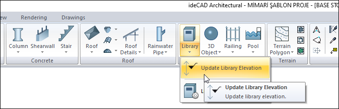 With the "Update library elevation" feature, the library elevation is changed by selecting one of the elevations in the list.