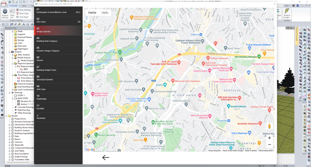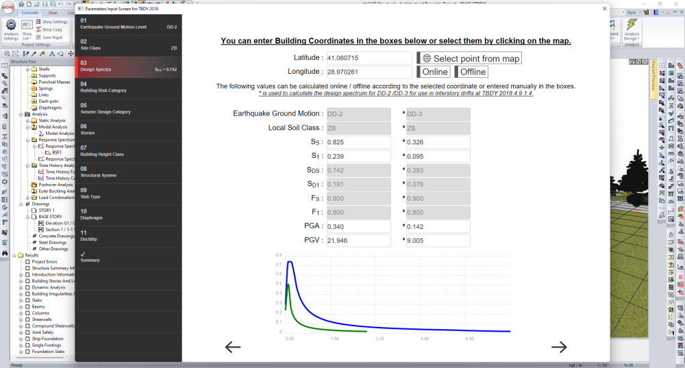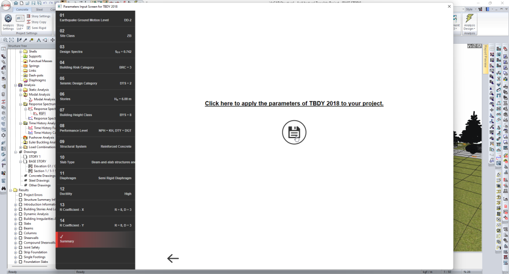 The project, which was prepared with ideCAD Architectural, was opened with ideCAD Structural. You can specify TDY conditions and the horizontal elastic design spectrum using the Analysis Settings Wizard. |