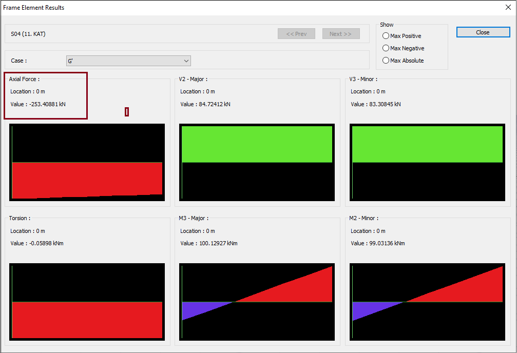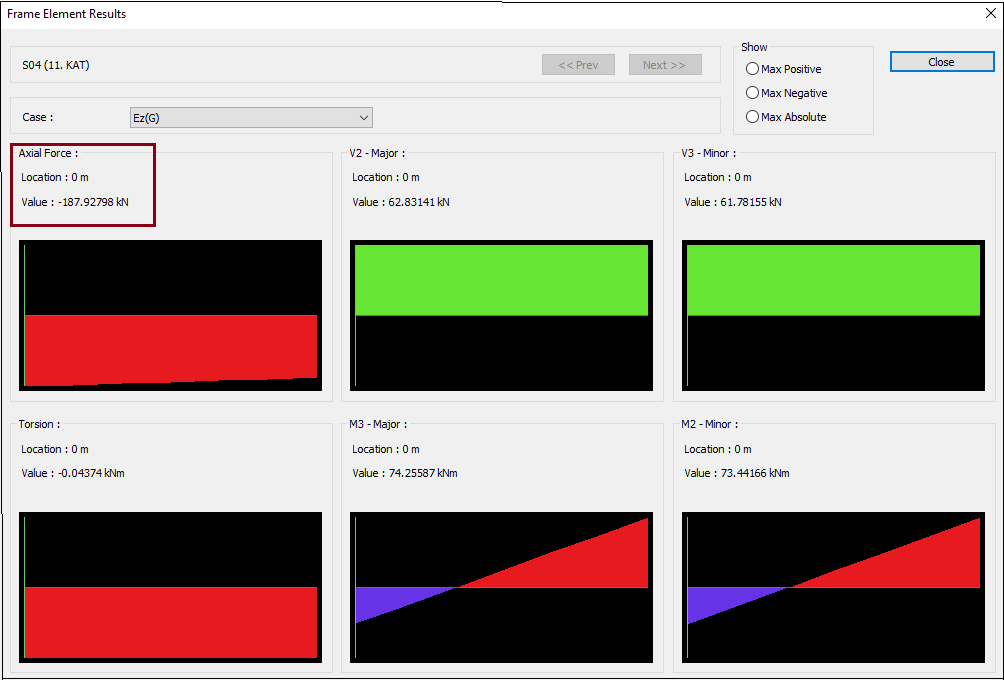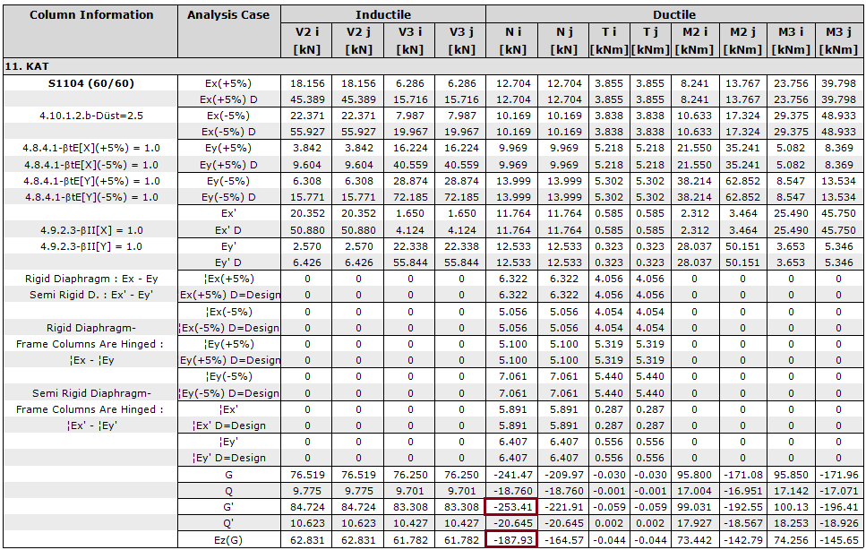 In order to perform the manual control, it is checked whether the ratio between G loading and Ed (Z) loading is equal to (2/3)SDS while examining the cross-section effects in the program interface. E.g; For the relevant column with images below, this ratio is calculated as follows: