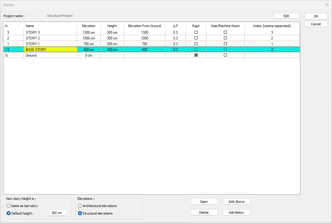 The live load participation rate is determined as 0.3 as per TBDY 2018 Table 4.3. ideCAD Structural story general settings are set in the LLF section. For detailed information, see: Mass Definition at Joints (4.5.9)