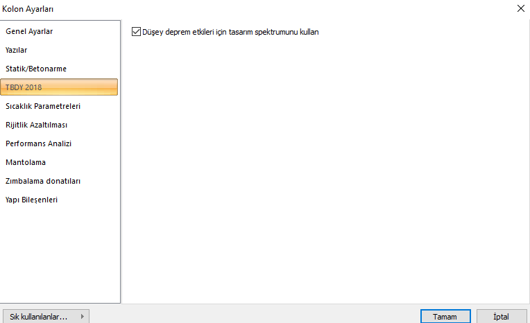 TBDY 2018 The element described in 4.4.3.1 (a) - (d) should be selected, and the option Use spectrum for vertical earthquake effects should be activated in the 'TBDY 2018' tab in its properties. If the analysis is made after the selection is activated, the modal-vertical status in the modal analysis title of the structure tree can be examined, and the information is also included in the subtitle of loading states and loading combinations in the optional report.
