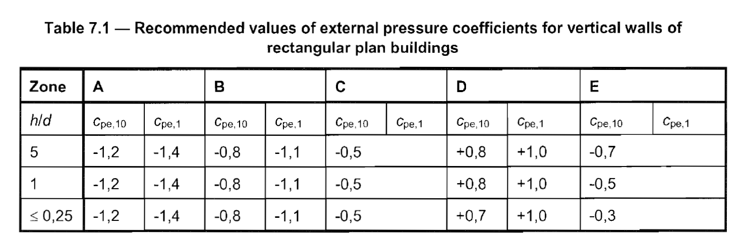 Pressure coefficients depending on reference heights, ze and aspect ratio h/b are calculated automatically.