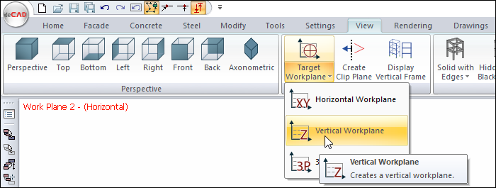 Click the Vertical Workplane icon from the View tab Workplane title in the ribbon menu.