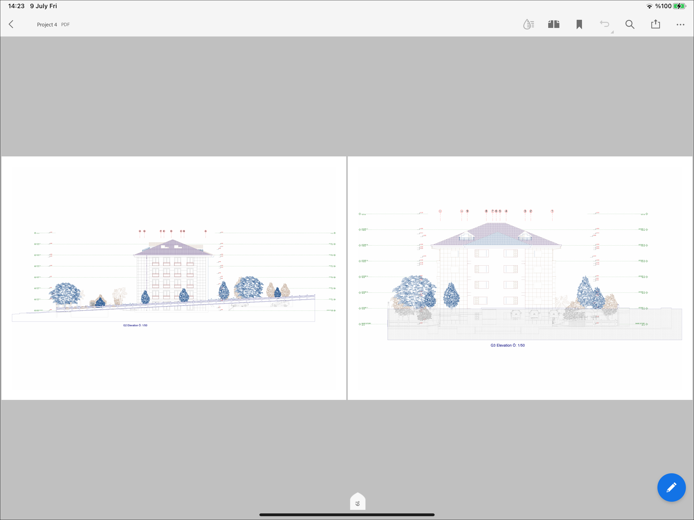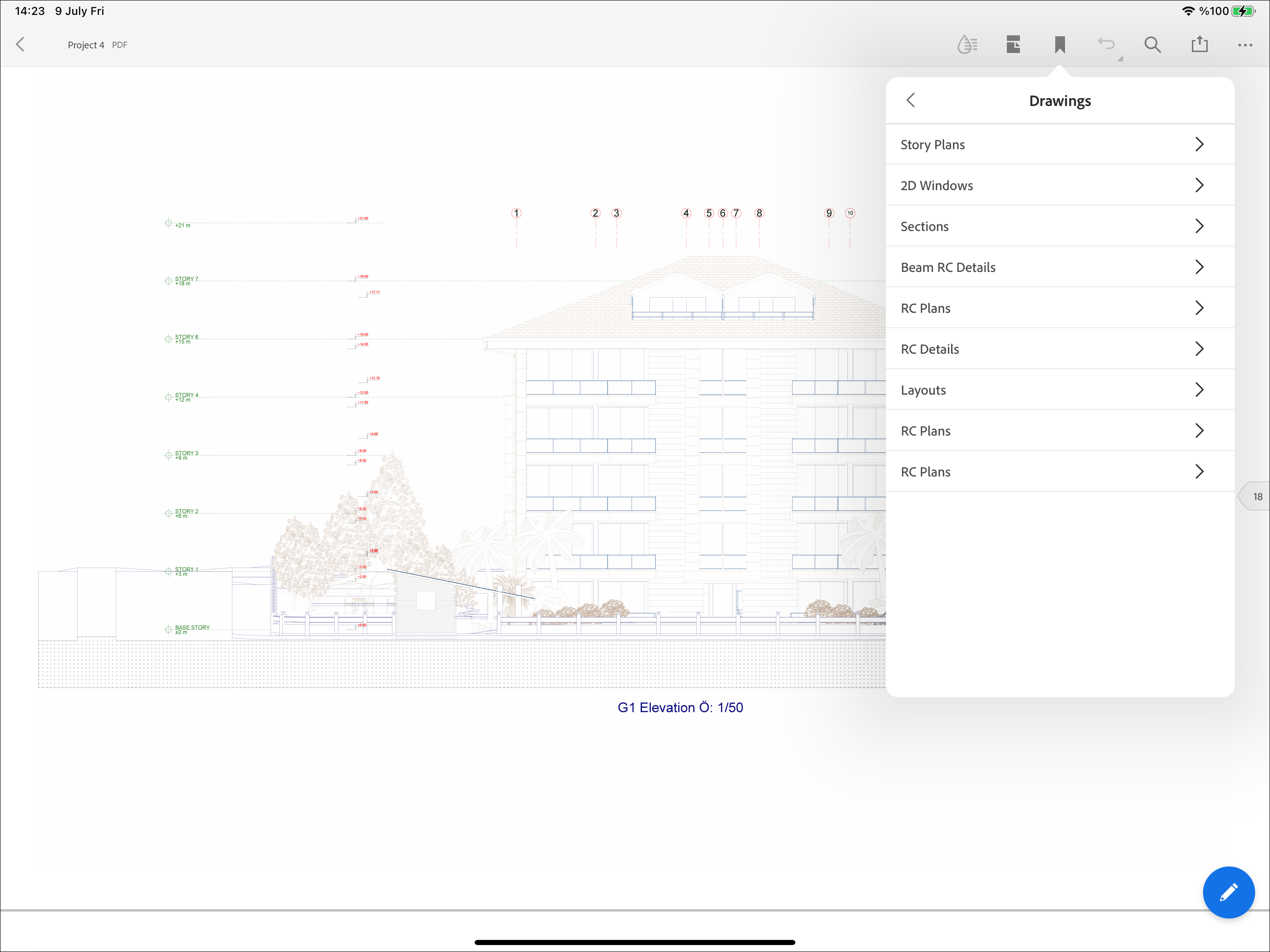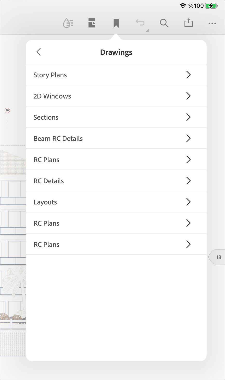 By touching the bookmarks sign, you can reach the list of drawings in the pdf file, and you can switch to the drawing you want from this list.