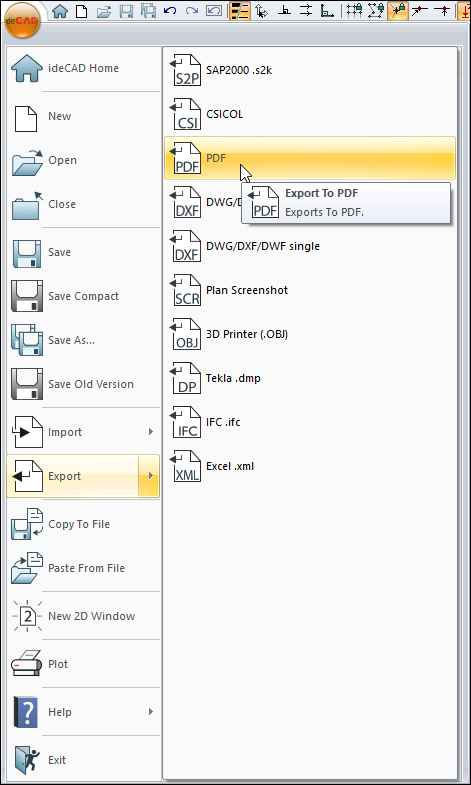 When the ideCAD Logo in the upper left corner of the program is clicked, the Export/Pdf command is clicked from the menu that opens.