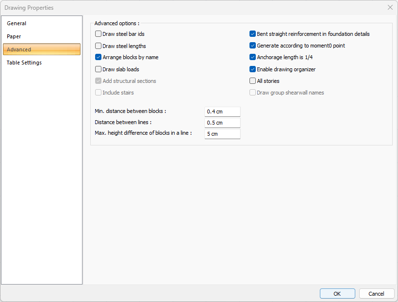 Distance between lines ![]() Minimum vertical distance between blocks is entered. The block is each opening itself, with its rebars, sections and dimensioning. |