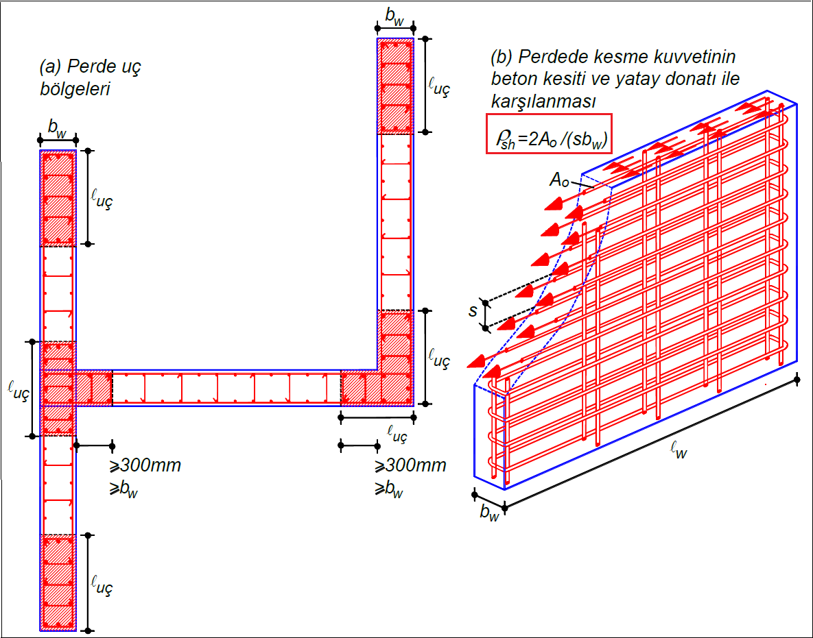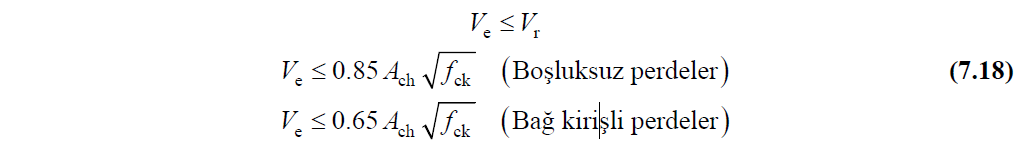 Considering the shear force capacity of the wall section created by the contribution of concrete and reinforcement and the prevention of non-ductile power depletion caused by the shear force, the following upper limits are foreseen for the design shear force. These upper limits are specified in TBDY Equation 7.18 .