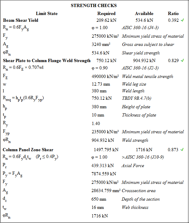 Design limit states of welded web connections are calculated automatically according to AISC 358-16 and AISC 360-16.