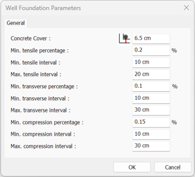With the Well Foundation Parameters command, the design parameters used in the Concrete Well Foundation Design are determined. Concrete cover, maximum and minimum reinforcement interval, etc. parameters are determined from the Well Basic parameters window.