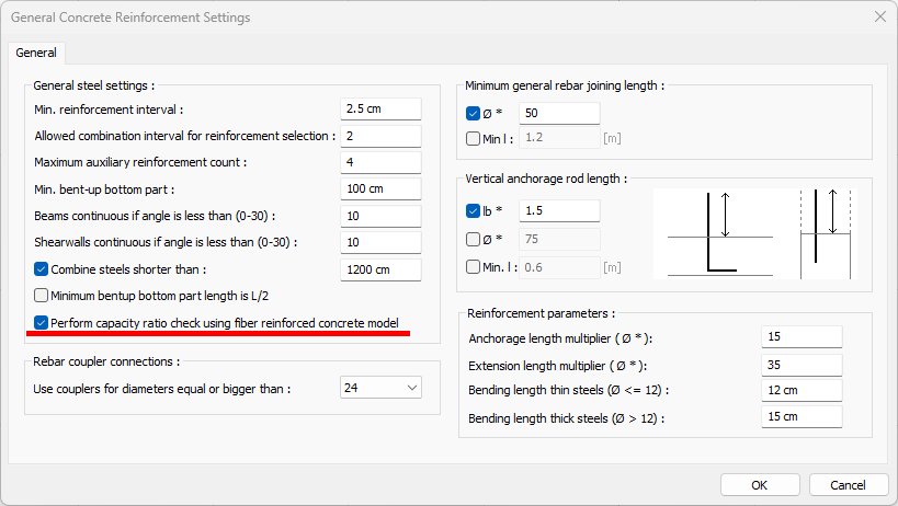 The calculated capacity ratios will be checked when the option to "Perform capacity ratio check using the fiber reinforcement concrete model" is active. Since this will create a low trading volume, if this option is disabled, a slight acceleration will occur.