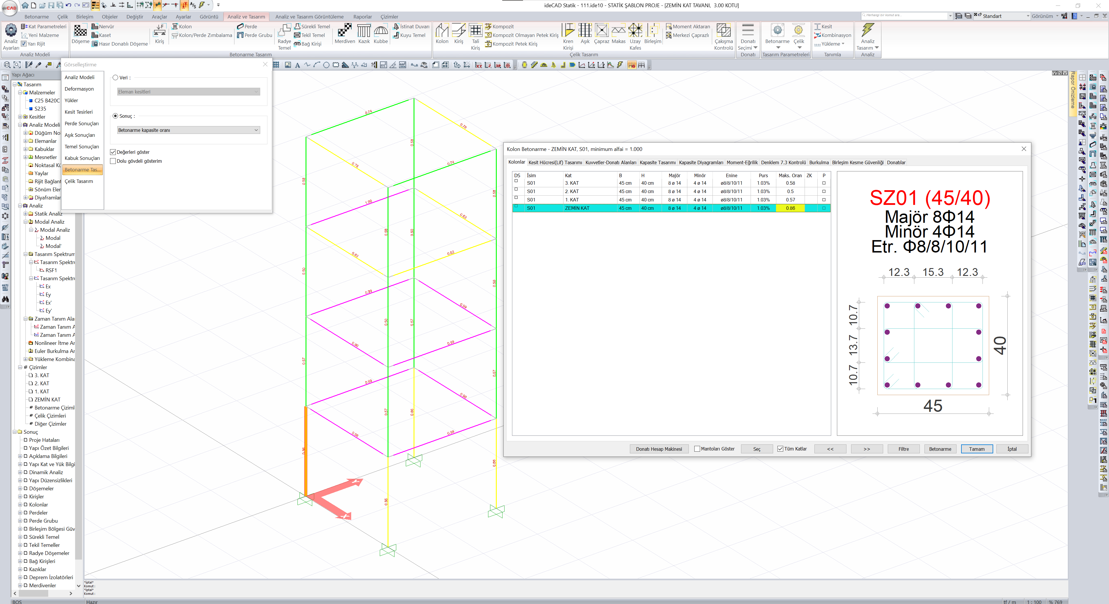 Statistically required purchase and maximum capacity ratio are related terms. Statistically required pursantage is the ratio of reinforcement required to meet the most unfavorable condition of the element under the influence of axial force and biaxial bending. The maximum ratio, on the other hand, expresses the highest capacity ratio of the column under the effect of axial force and biaxial bending, from the capacity ratios calculated under the effect of all combinations and in the existing reinforcement placement.
