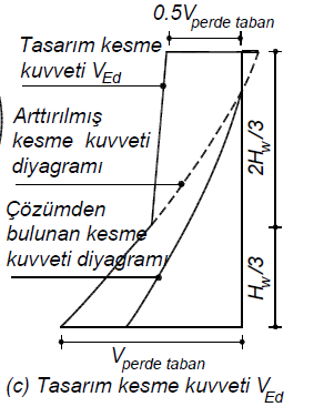 TBDY Figure 7.12(c) shows the wall design shear force graph. The design shear force at the top of the wall shall be taken as half of the design shear force at the bottom of the wall. For the part larger than H w /3, the shear force at the H w / 3 point and the shear force taken as half of the wall base at the top of the wall will be combined with a linear line to form a design shear force diagram.
