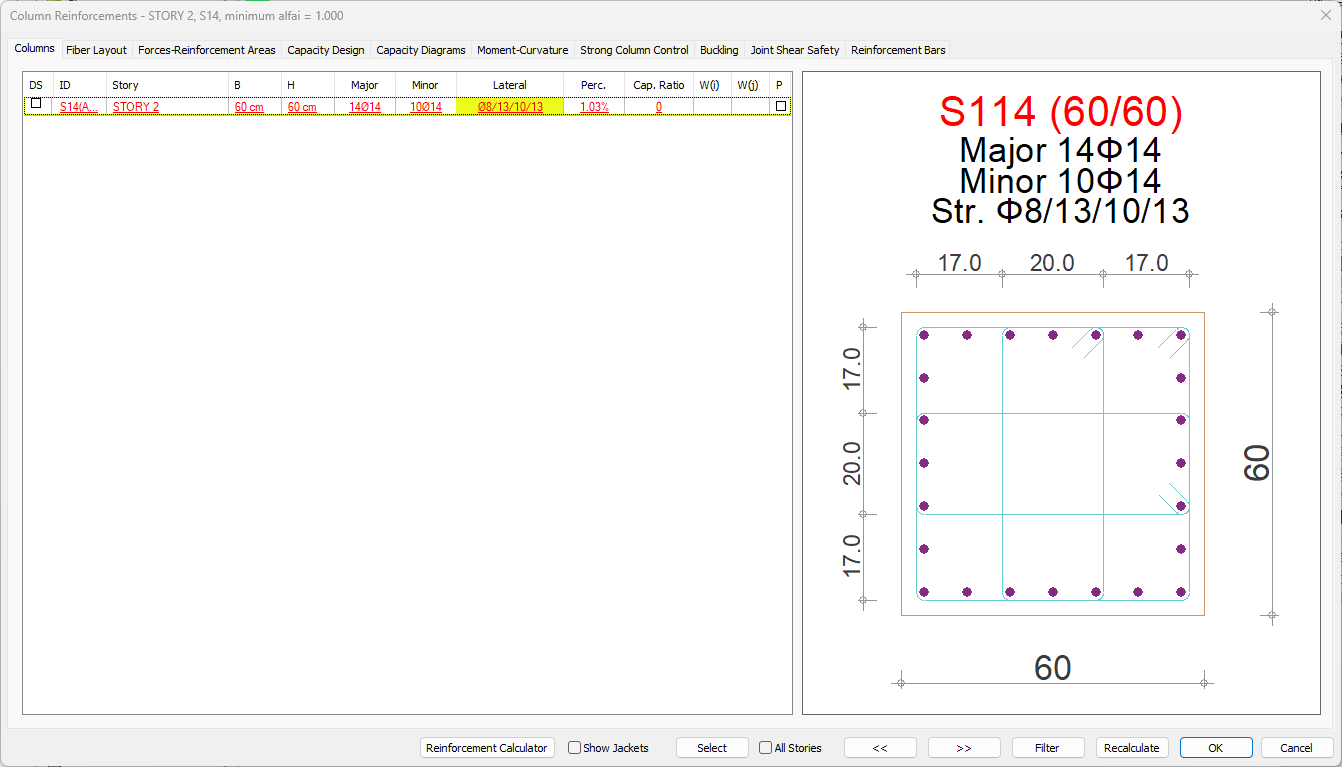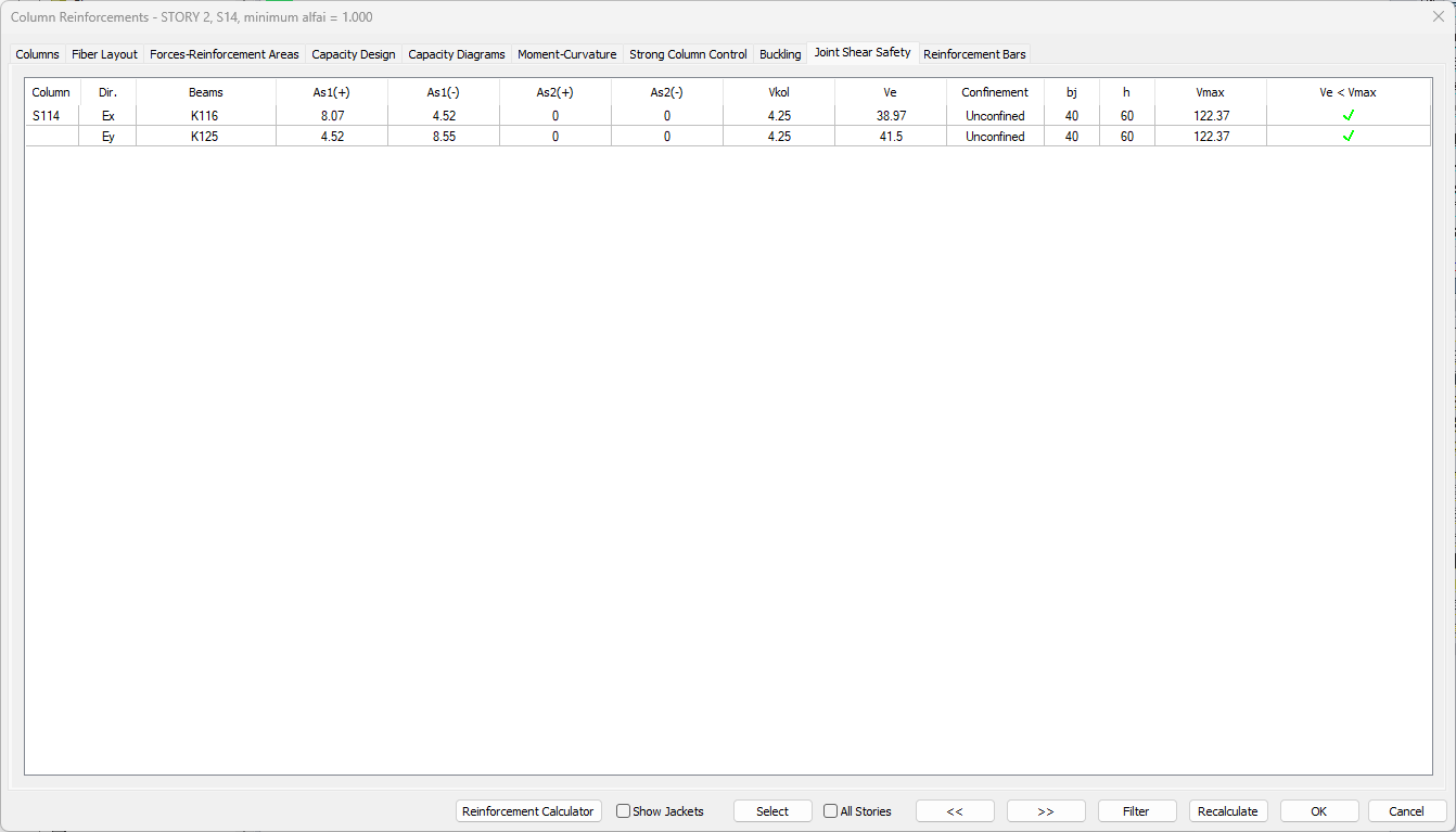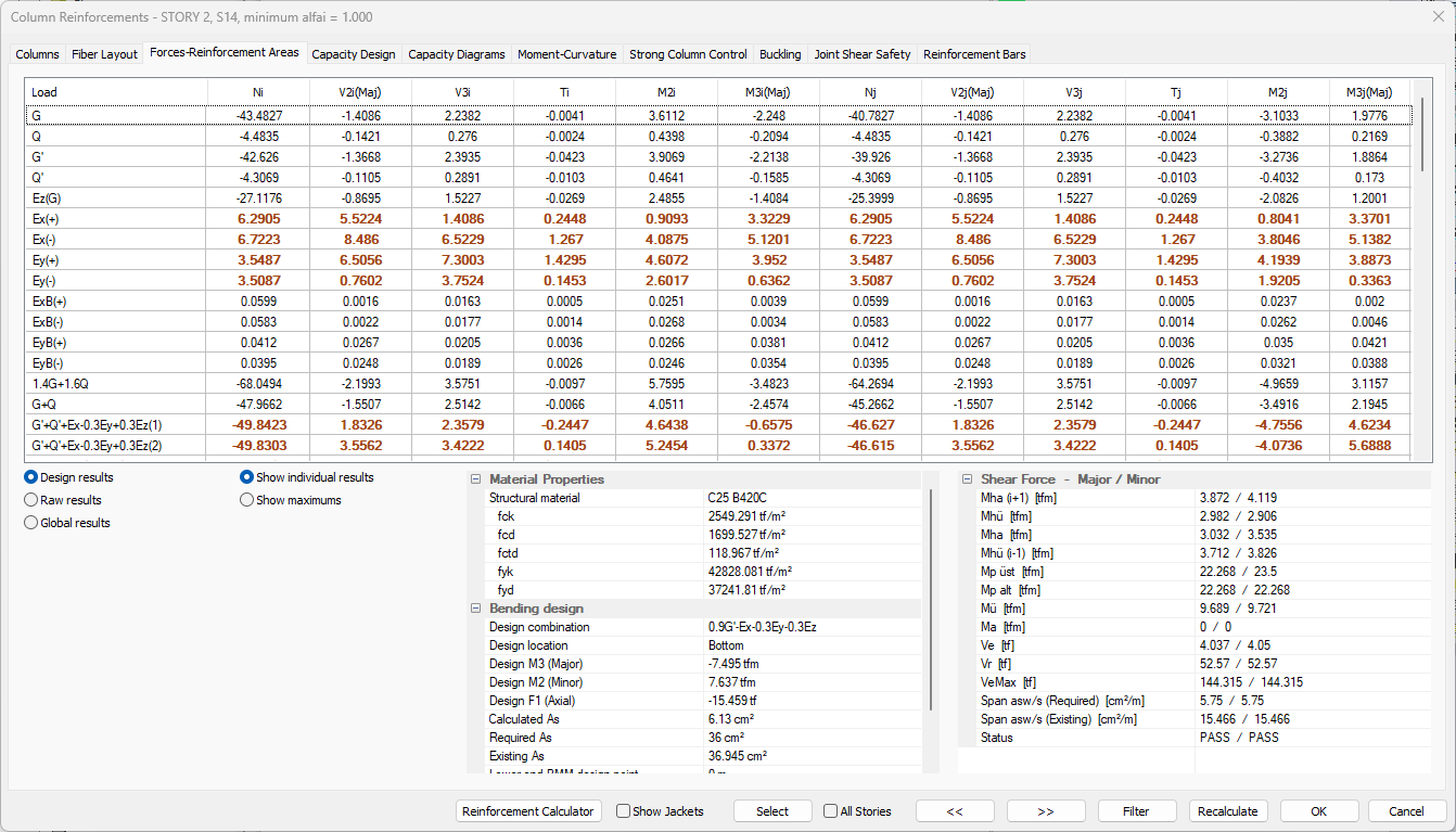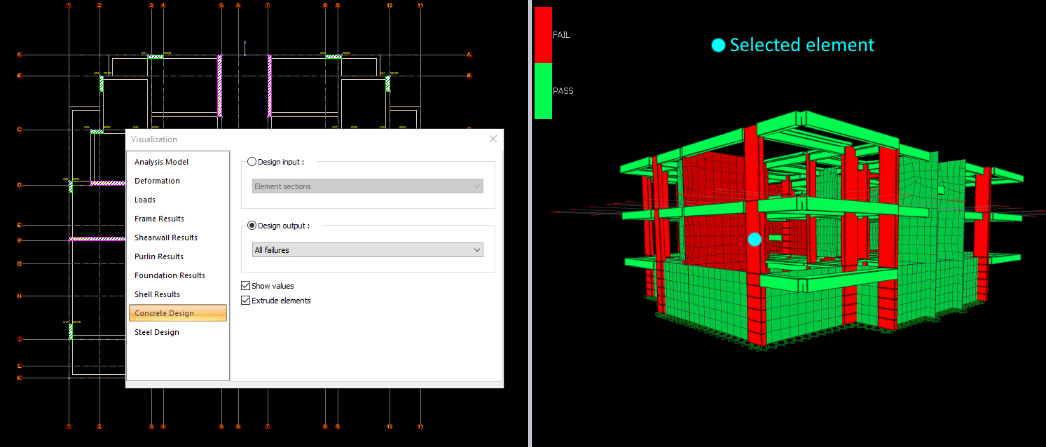 After the Analysis+Design is done, while the "All failures" is active on the 3D analysis model visualization screen, the element concrete design results dialog is opened by clicking on any element. The element design results dialog contains the results for the amount of reinforcement, design ratio, internal forces, and design forces.