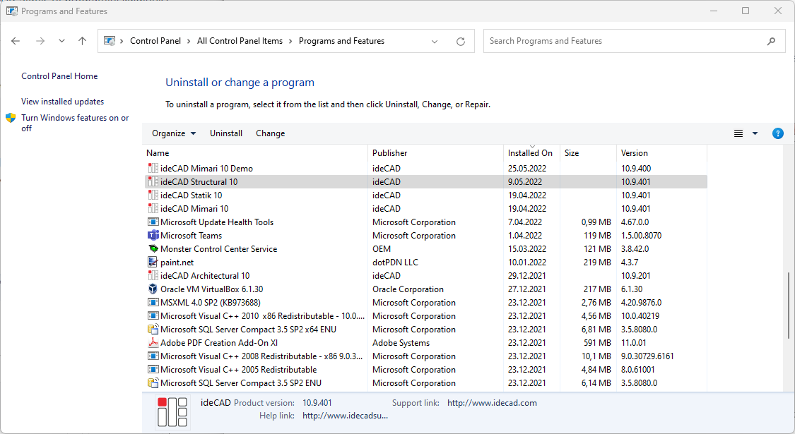Uninstall ideCAD Structural 10 program from Programs and Features section.