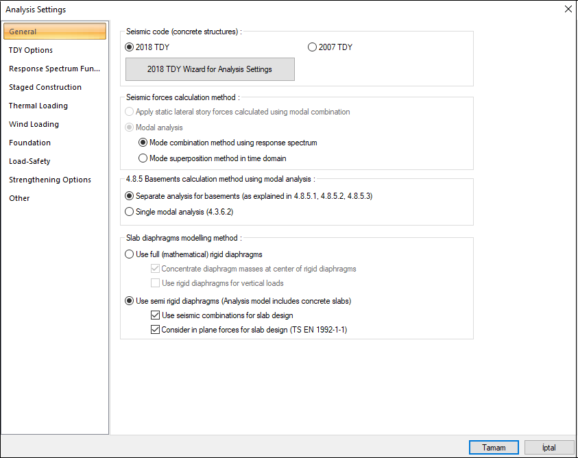 With the analysis settings wizard developed by ideCAD, the seismic code parameters required for analysis and design are displayed sequentially. On the wizard screen, the ground motion level, site class, design response spectra, building risk category, performance level, structural system type, slab type, ductility level and design coefficients and factors to be used for x and y directions are displayed in order definable.