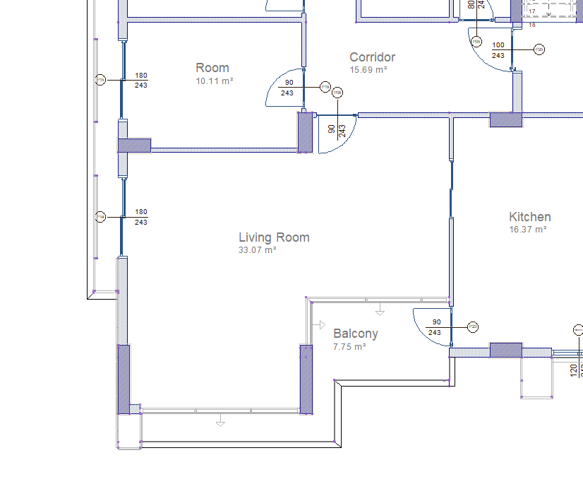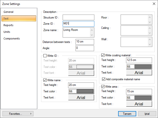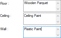 With the feature of coating material texts material names for floor, wall and ceiling can be written and can be displayed in the plan.